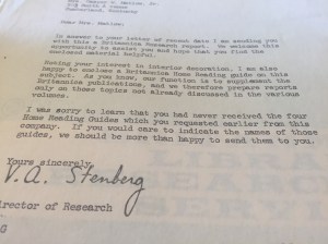 When I was going through these old papers that my mother retained over the next half century and four different houses, what brought tears to my eyes was a letter from V.A. Sternberg, director of research at the Encyclopedia Britannica Library Research Service in Chicago. “Dear Mrs. Matlow,” said the letter dated Feb. 6, 1961, “In answer to your letter of recent date I am sending you with this a Britannica Research report.” Still stapled to the letter was a 21-page typewritten report on “Home Freezing of Foods.” The letter continued, “Noting your interest in interior decoration, I am also happy to enclose a Britannica Home Reading guide on this subject.”